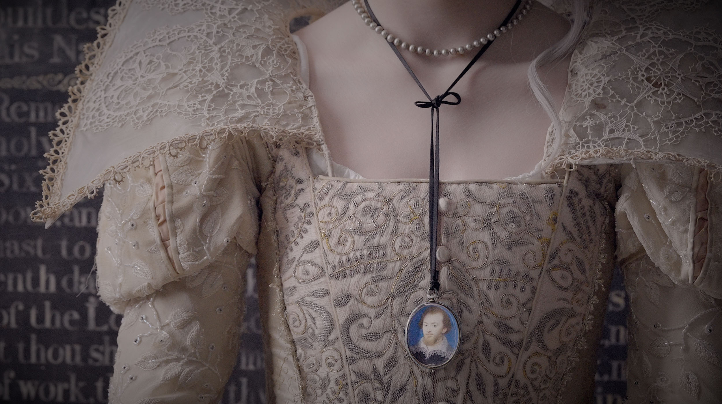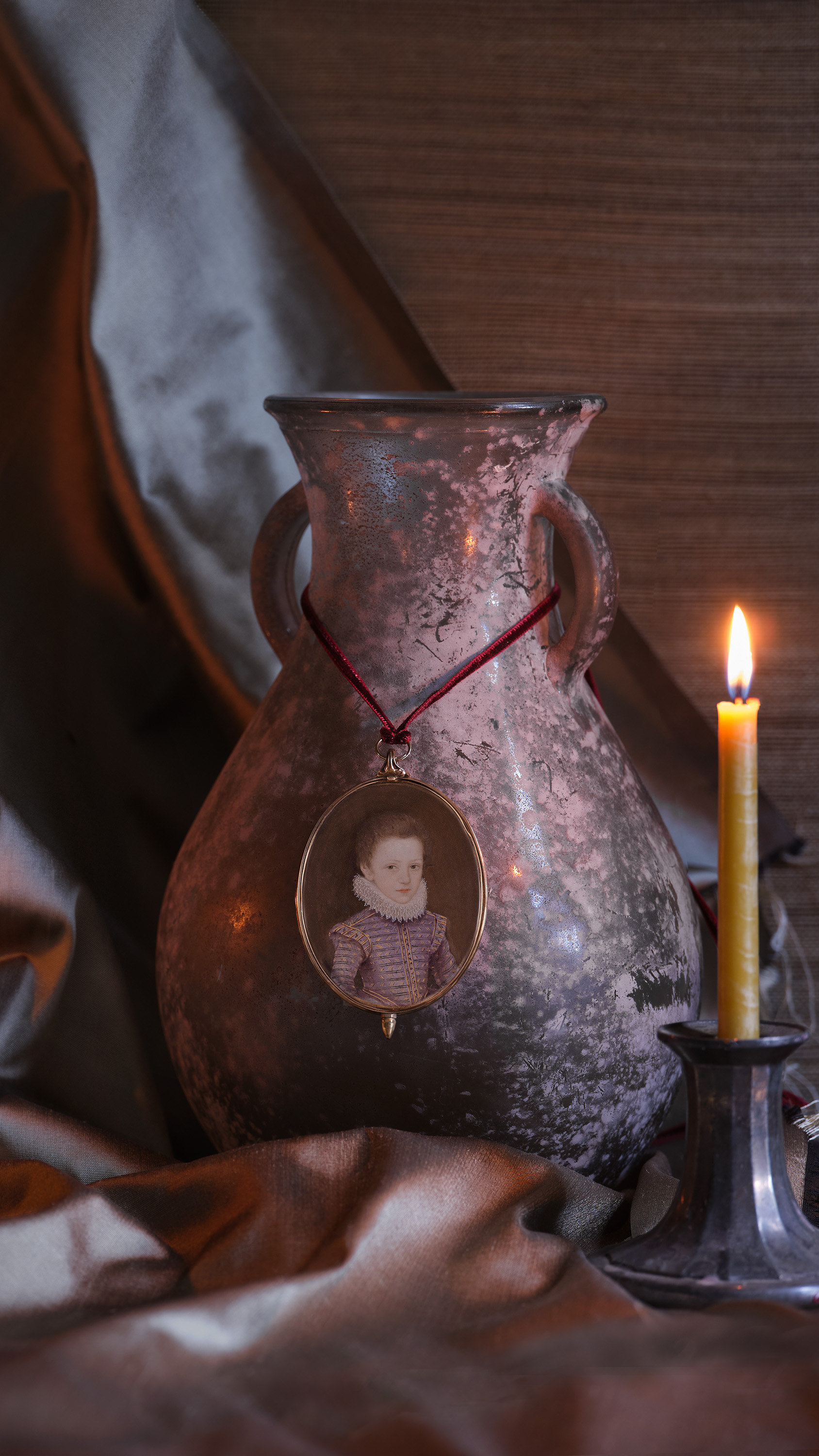 Figure 3- An image of a woman wearing a miniature on a ribbon, taken for the 2024 exhibition The Reflected Self, Compton Verney.