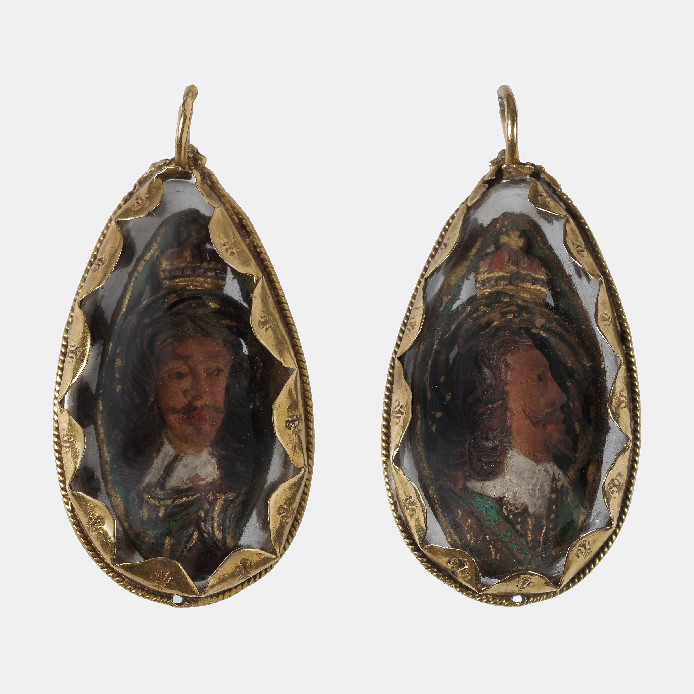 Figure 18- Attributed to THOMAS RAWLINS (1620?–1670), A fruit stone (probably a plum or peach stone) carved on both sides with portraits of King Charles I and King Charles II, with royal insignia, coloured and gilded, set into the original gold and rock crystal locket, the gold engraved with fleur de lys pattern. For sale with The Limner Company (POA).