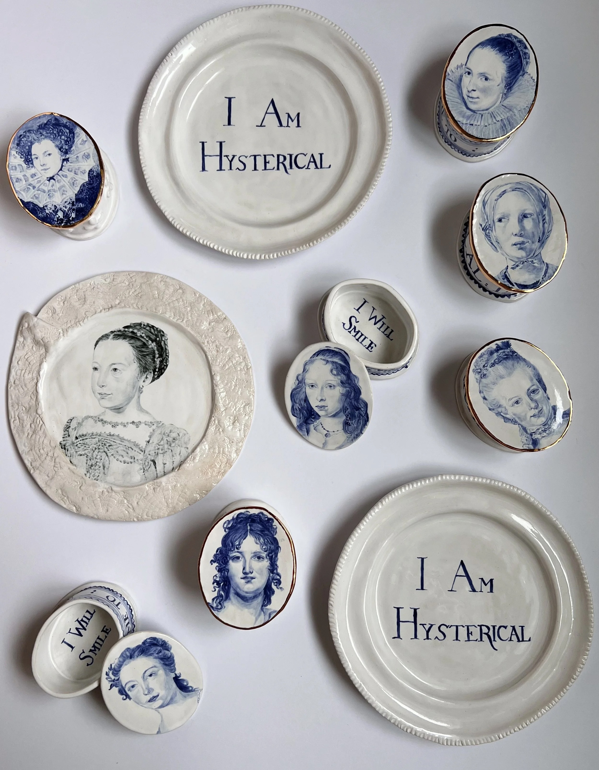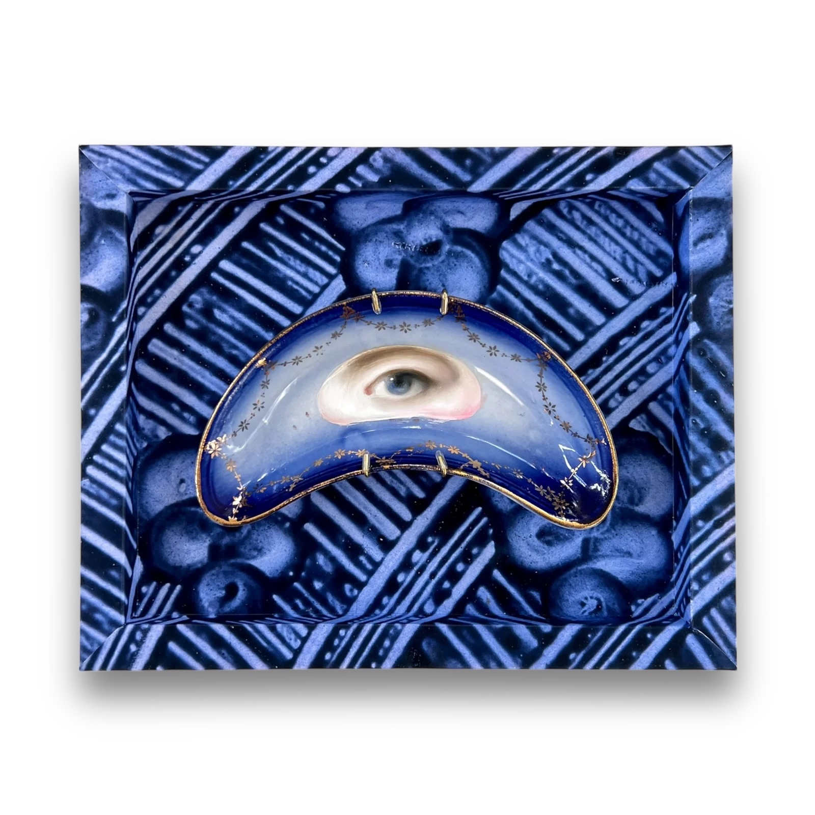 Figure 13- Susannah Carson, No. 2988 Lover's Eye Painting on a Flow Blue Crescent Plate, china displayed on blue ironstone plate, £302, available through her website.