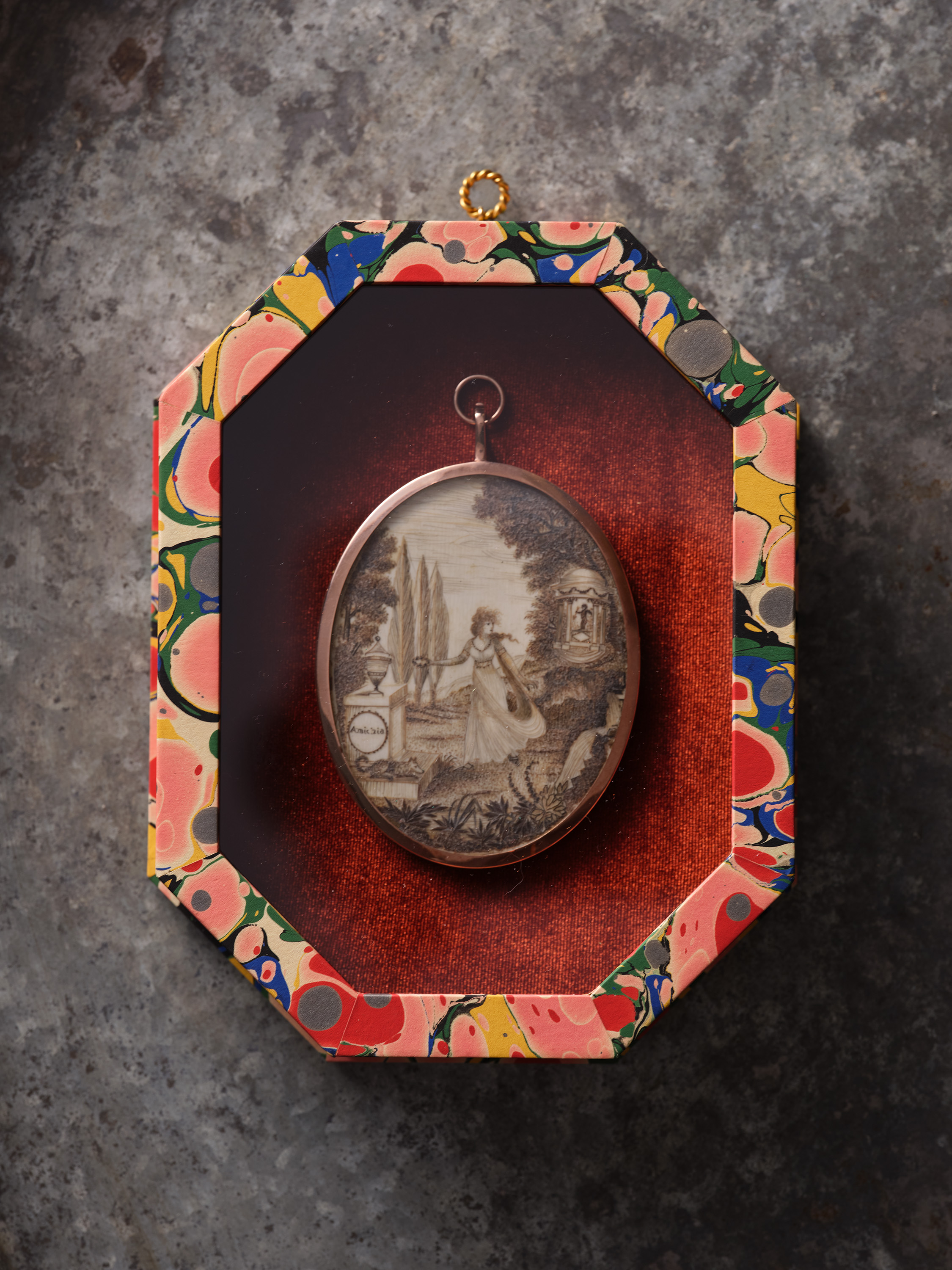 If someone you know has their own miniatures and other artworks yet to be displayed, the Limner Company is offering a selection of marbled boxes, created by Parvum Opus. These boxes function as frames for miniatures and are deep enough to house an artwork, which can in turn be hung on a wall or displayed beautifully on any flat surface. Here, one of the boxes (available for £350) is shown with a uniquely well-preserved, double-sided hairwork miniature (available for £1,750). For more examples of how artworks can be displayed in these cases, take a look at this beautiful project featuring contemporary eye miniatures by Irene Owens, collaborating with Art/Artefact.