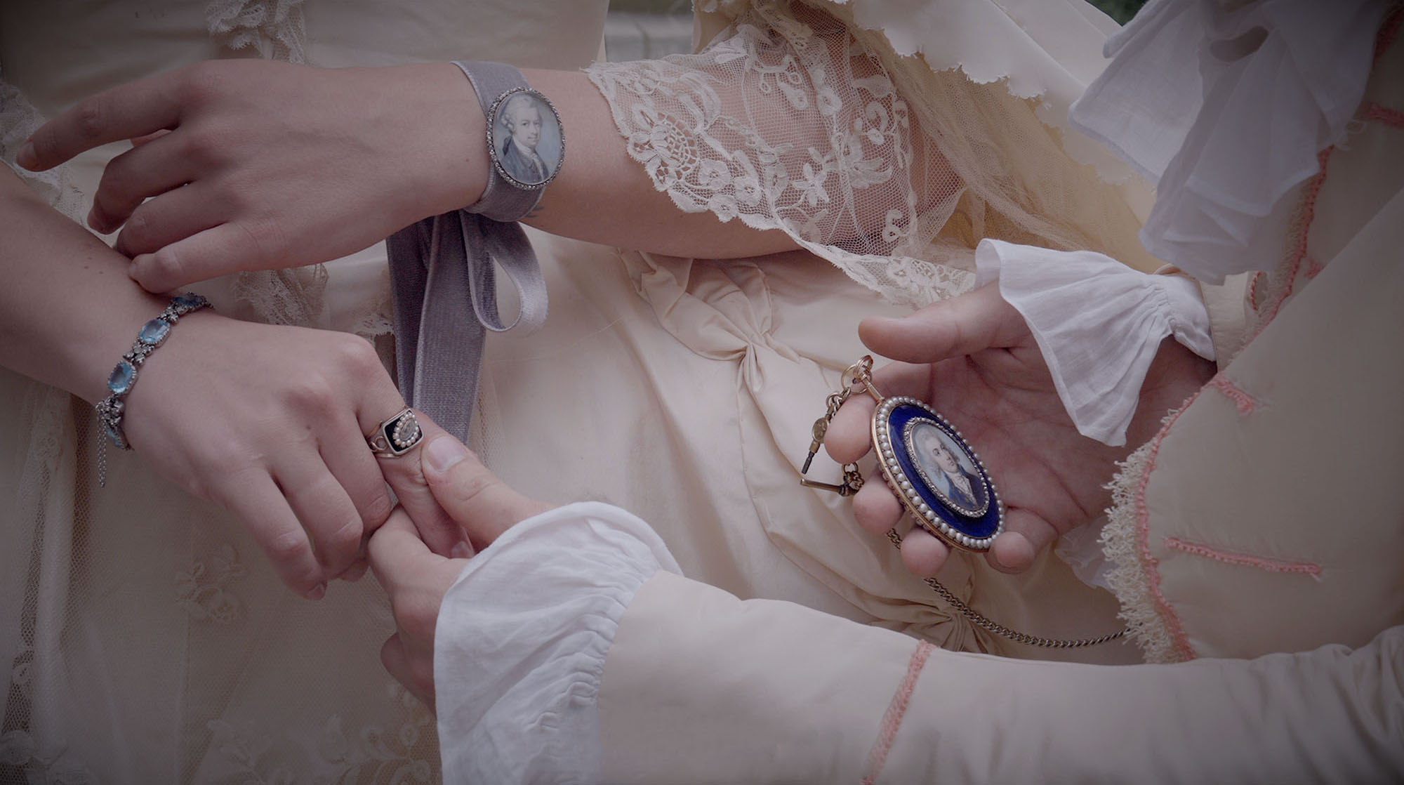 Rings were also a traditional way to wear miniatures. Most often, portraits set into rings were intended as mourning jewellery, as with this ‘Lovers Eye’ mourning ring, featuring the eye of a young woman named ‘Ellen Jane’ (Reserved). It is possible to identify this as a mourning ring because of the black-and-white enamel surround; the white four-leaf clovers, specifically, would have conveyed the message to ‘think of me’.