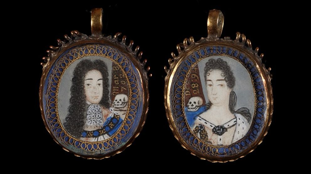 These memorial miniatures are a perfect example of how small and intimate these works of art can be. Painted following the death of King William III (1650-1702) and Queen Mary II (1662-1694), these tiny (16mm high) portraits (reserved) are both surmounted by loops which would have allowed them to be worn on a chain or ribbon by those mourning the death of the King and Queen. This has always been a common way to wear miniatures, as demonstrated in figure 3 below. It is tempting to envision the pair mounted as a brilliant pair of statement earrings to be worn today.