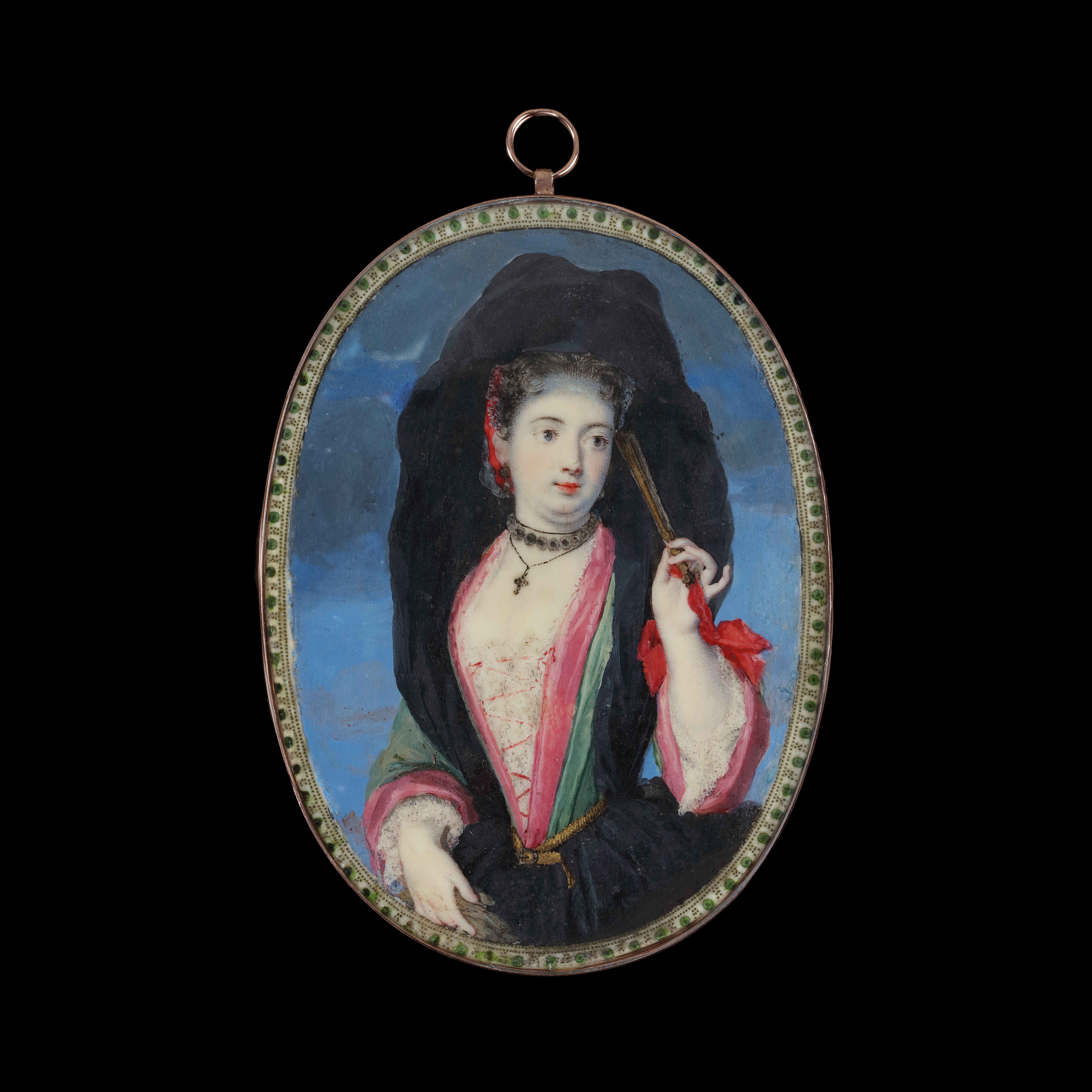 Her zendale, or the black silk and lace hood, dominates the portrait. These items of clothing were both important in the everyday life of Venetians, and, most significantly, were worn with masks during carnival. Combined with a mask, the hoods provided a disguise, and were worn by both men and women to hide not only their identity but possibly their gender. Another miniature showing a woman in the same type of hood in the Wallace Collection[10] indicates the popularity of these accessories, or perhaps that Carriera had one in her studio for sitters to wear, if they wished.