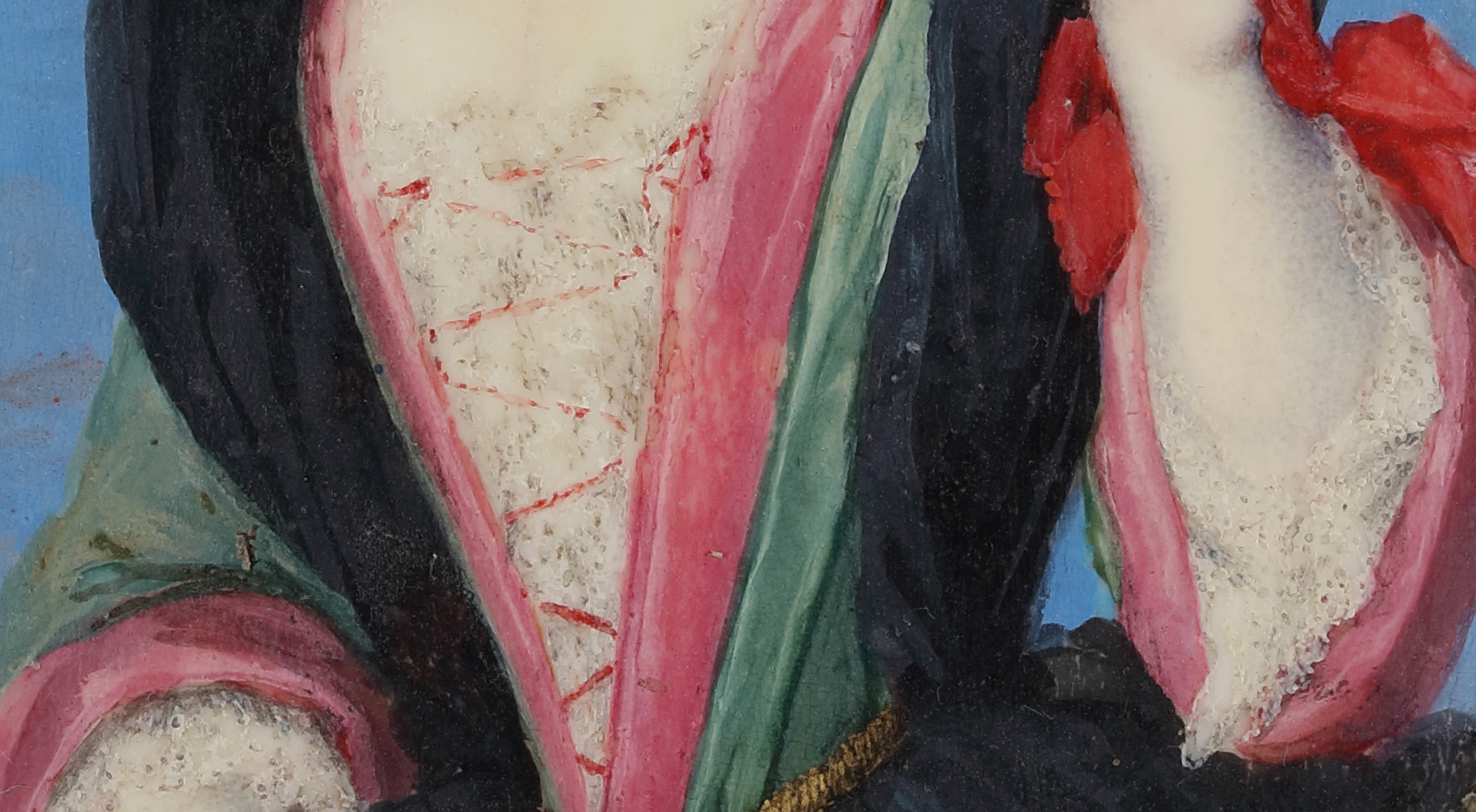 Fig. 7: Detail from ROSALBA CARRIERA (1675-1757), Portrait miniature of a lady in Venetian dress, c.1710-20, watercolour and bodycolour on ivory, oval, 3 5/8 in. (94 mm) high, sold by The Limner Company.