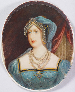 The tradition of these sets did not die out completely in following centuries, and the Royal Collection has two examples of nineteenth century sets. One of these includes a portrait of Princess Charlotte of Wales (1796-1817) (fig. 7). Charlotte was the granddaughter of George III (1738-1820) and was the heir to the throne through her father, who would later become George IV (1762-1830). She died at the age of 21 during childbirth. The set, which is the only one discussed here to have a named artist, Denis Brownell Murphy (c. 1745-1842), was painted three years before the princess’ death and contains historical costumes, including an Elizabethan ruff and gable hood. It is more likely that this set was produced for entertainment; Charlotte may have known of the seventeenth-century sets in the collection and simply wanted one of these for herself to experiment with.