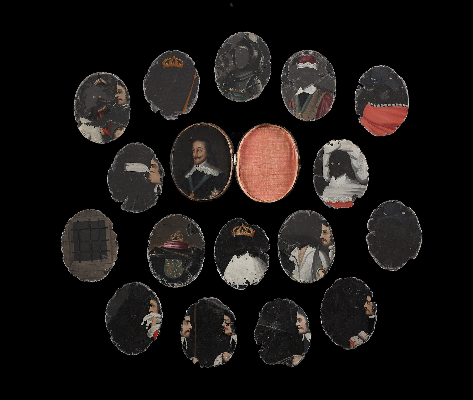 An insight into the function of these miniatures: A set of 16 costume overlays and an oil portrait of Charles I